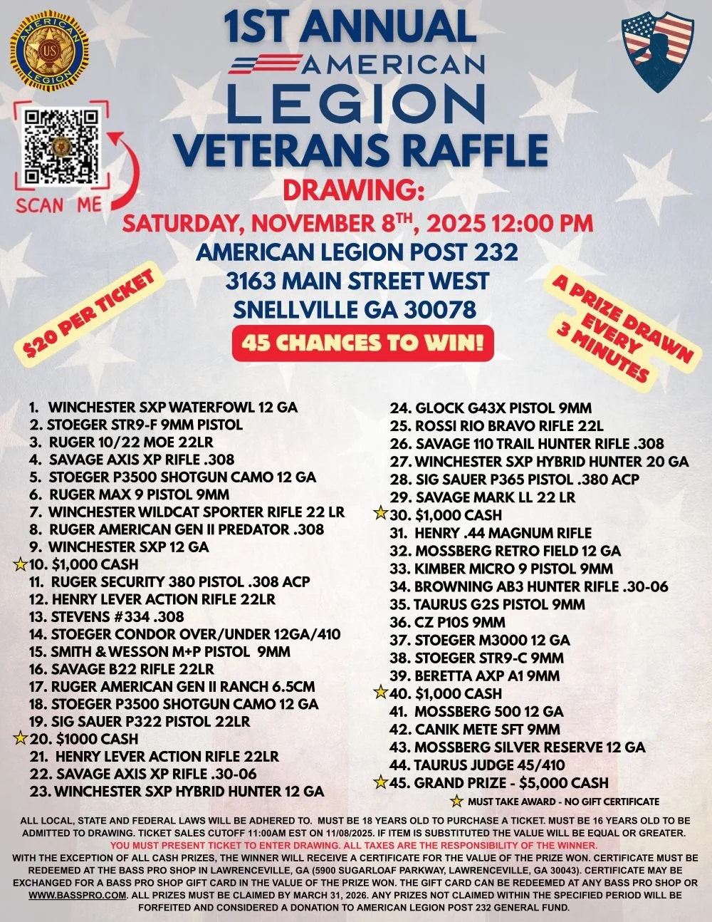 American Legion Georgia District 9 and Snellville Post 232 are hosting a District-wide raffle fundraiser now through November 8. Tickets are $20, and each ticket has 45 chances to win some really awesome prizes.